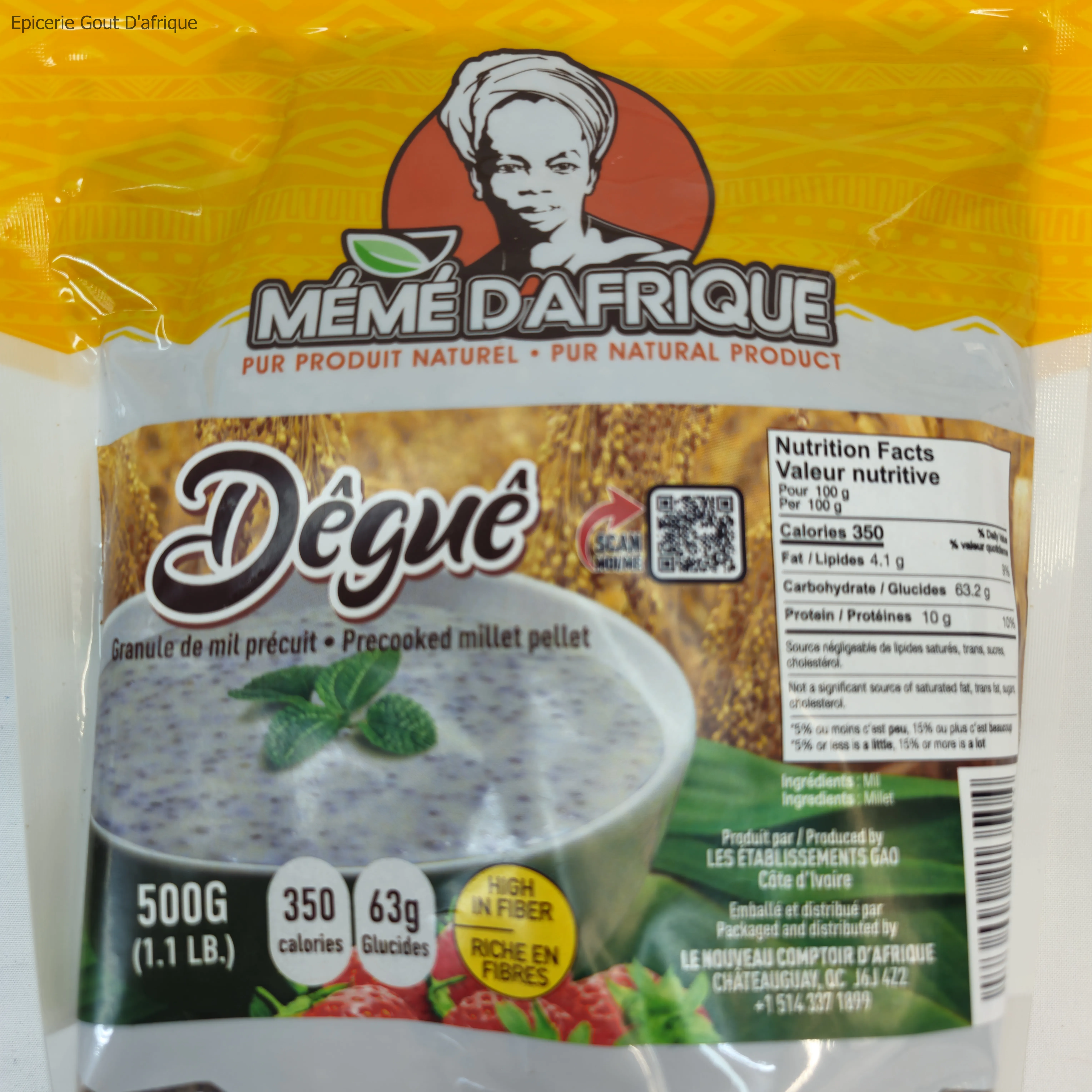 Le Degué est une spécialité culinaire d'Afrique de l'Ouest, particulièrement appréciée pour sa richesse en saveurs et sa texture crémeuse. Ce dessert traditionnel est à base de millet ou de couscous, mélangé avec du yaourt, du lait et sucré à souhait. Il est souvent parfumé avec des épices comme la cannelle ou la vanille, offrant ainsi un goût unique et agréable. Le Degué peut être servi en dessert ou en collation et est un excellent choix pour une alimentation nourrissante et savoureuse. Disponible chez Épicerie Goût d'Afrique, votre boutique en ligne au Canada, il apporte un goût d'authenticité et de tradition à vos repas.