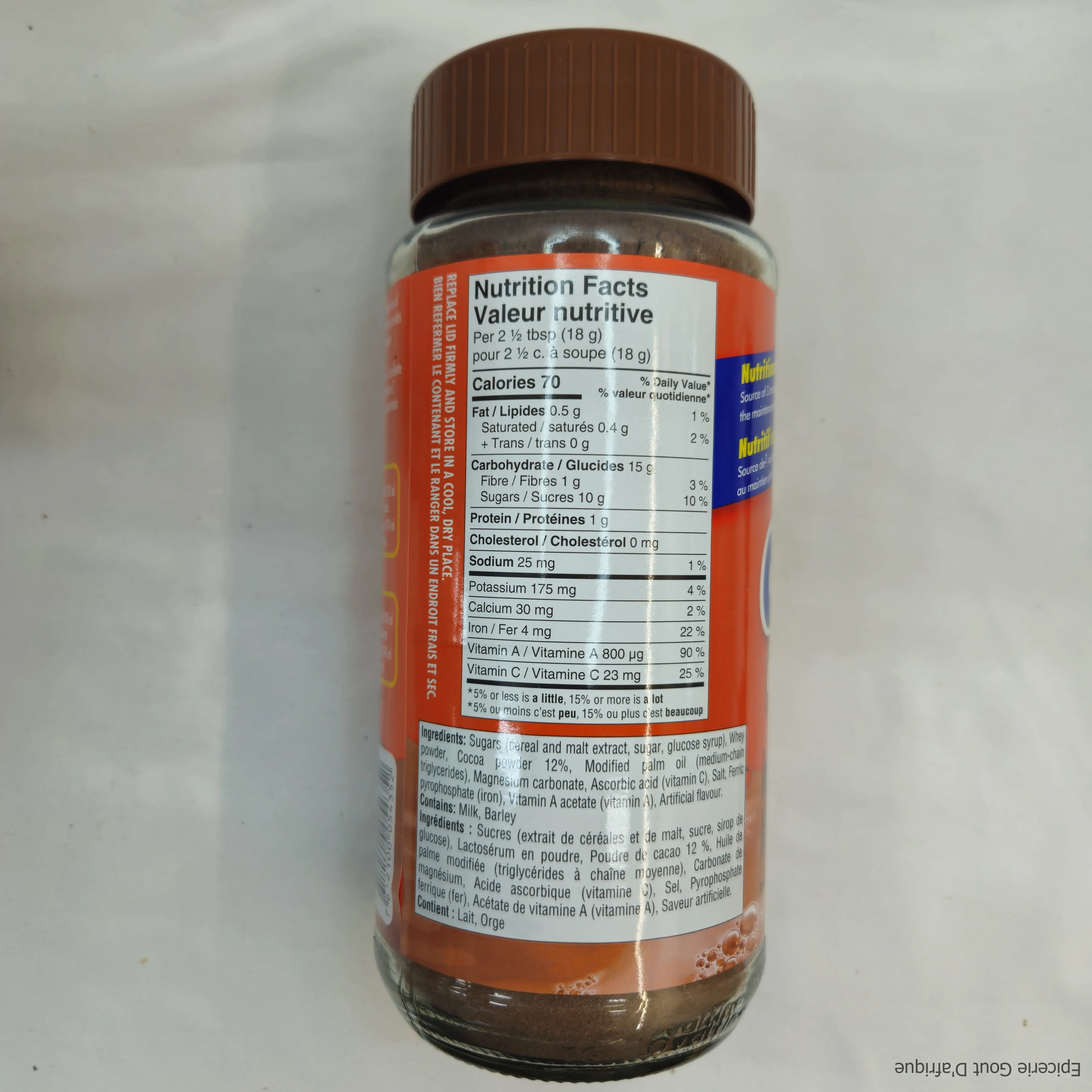 L'Ovaltine Chocolat est une boisson en poudre au chocolat riche en saveur et en nutriments, idéale pour toute la famille. Mélangée avec du lait, cette boisson chaude ou froide devient un moment de plaisir, parfait pour le petit déjeuner ou une collation. Avec sa texture lisse et son goût délicieux, l'Ovaltine Chocolat offre une excellente source de vitamines et de minéraux, tels que le fer et le calcium, qui sont bénéfiques pour la santé. Facile à préparer, c'est une boisson qui ravira les amateurs de chocolat tout en étant une option énergétique et nourrissante. Disponible chez Épicerie Goût d'Afrique, votre boutique en ligne au Canada, l'Ovaltine Chocolat est un choix parfait pour un goûter savoureux et équilibré.
