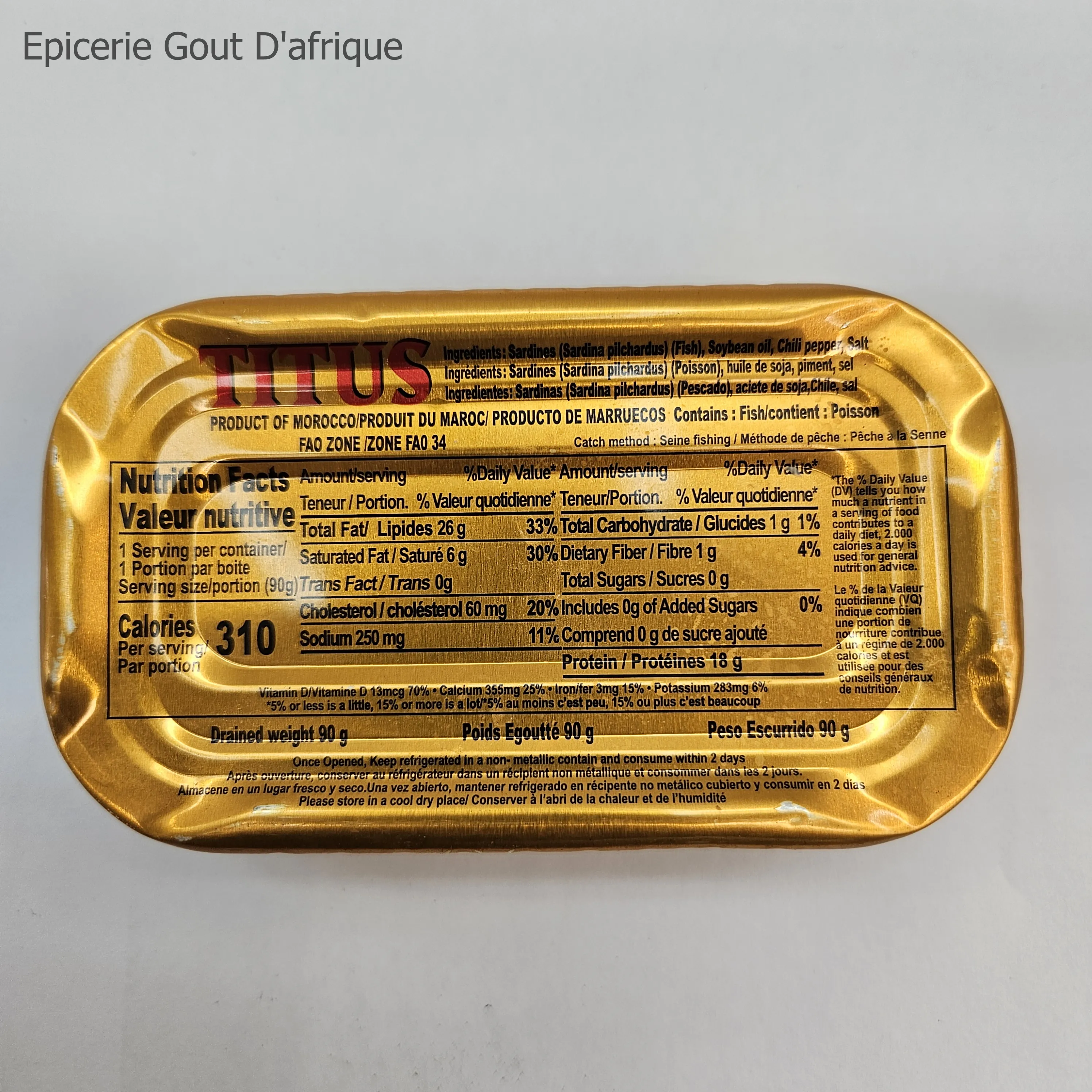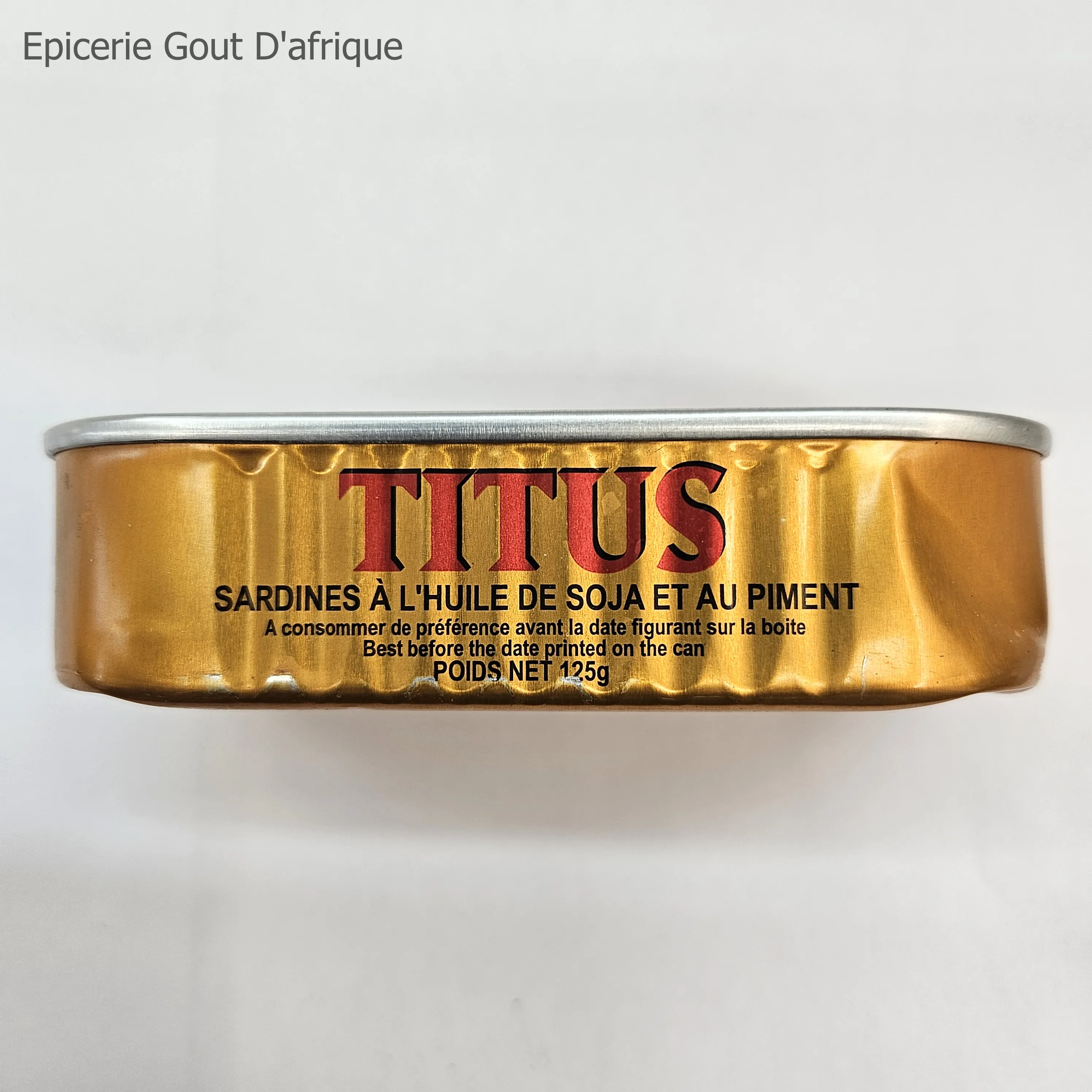 Les sardines TITUS sont synonymes de qualité et de goût authentique. Conservées dans une huile délicate, elles offrent une saveur riche et une texture tendre, idéales pour sublimer vos repas. Source exceptionnelle d'oméga-3, de protéines et de nutriments essentiels, ces sardines s’intègrent facilement à une variété de recettes : salades, sandwiches, tartines ou plats chauds. TITUS est une marque reconnue pour son excellence, alliant tradition et satisfaction. Retrouvez les sardines TITUS chez "Épicerie Goût d'Afrique", votre boutique en ligne au Canada, pour ajouter une touche de saveur marine à votre cuisine quotidienne.