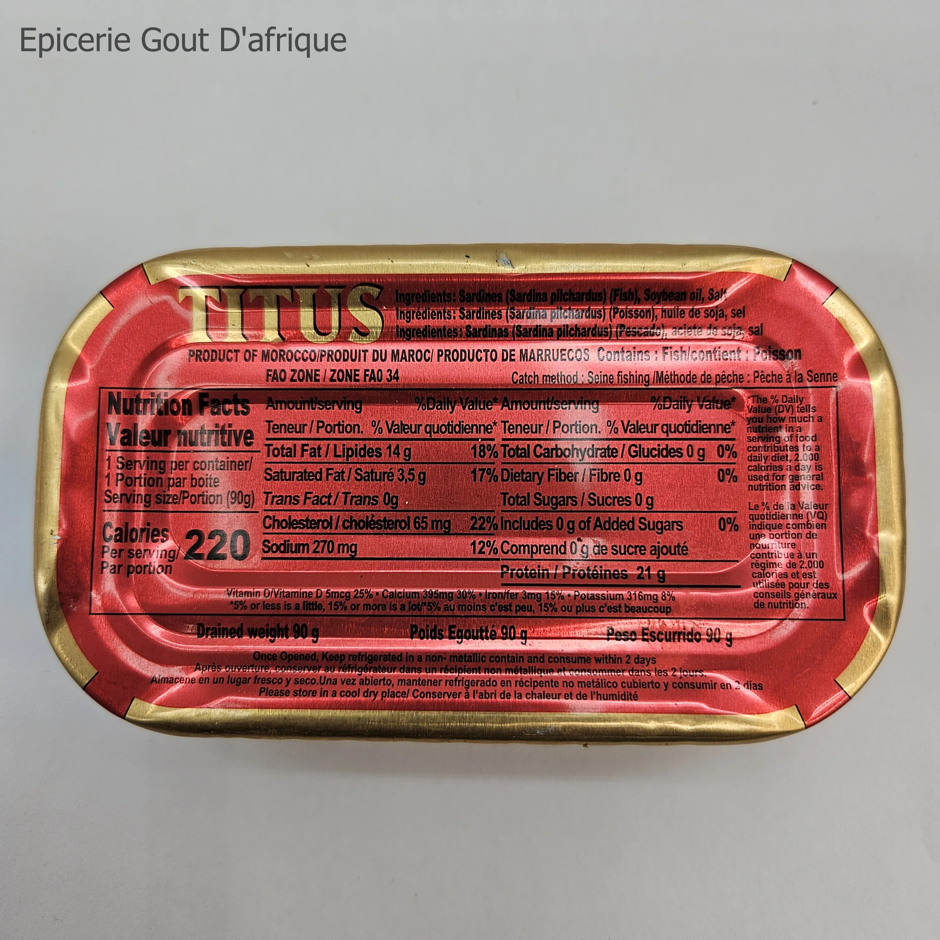 Ajoutez une touche épicée à vos repas avec les sardines TITUS pimentées, un véritable délice pour les amateurs de saveurs relevées. Conservées dans une huile aromatisée au piment, ces sardines offrent un équilibre parfait entre le goût riche et la chaleur subtile des épices. Riche en oméga-3, en protéines et en nutriments essentiels, ce produit est idéal pour agrémenter vos salades, sandwiches, plats de riz ou pâtes. Avec leur qualité exceptionnelle et leur goût distinctif, les sardines TITUS pimentées sont un incontournable pour sublimer vos plats. Retrouvez-les chez "Épicerie Goût d'Afrique", votre boutique en ligne au Canada, pour un voyage culinaire unique.
